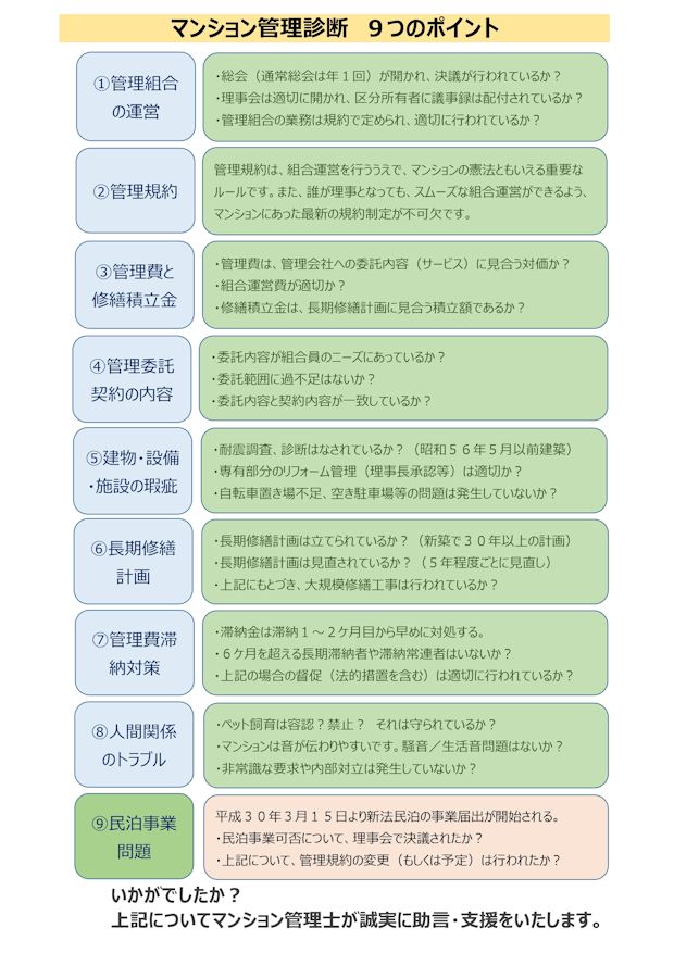 このマンション管理をするうえでのポイントを、「マンション管理診断 9つのポイント」にまとめました。